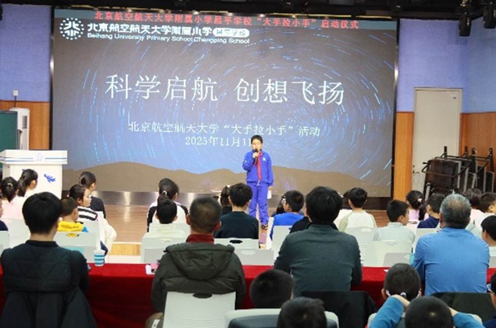 88038威尼斯党委副书记李时宇在致辞中回顾了“大手拉小手”项目二十余年的发展历程与育人成效,阐述了其在弘扬张启先院士科学精神、激发青少年空天报国志向方面的重要意义。他谈到,在张院士身上展现出的科学家精神是应当传承与弘扬的宝贵财富,要持续发挥好“大手拉小手”活动在科普实践与精神传承方面的积极作用,通过互促共融提升育人实效。同时,他也对大学生校外辅导员提出期望,希望他们以热忱与责任担当起科学引路人的角色,在传递知识的过程中锤炼能力、体悟使命,以实际行动践行启先精神,为培养未来科技人才贡献力量。