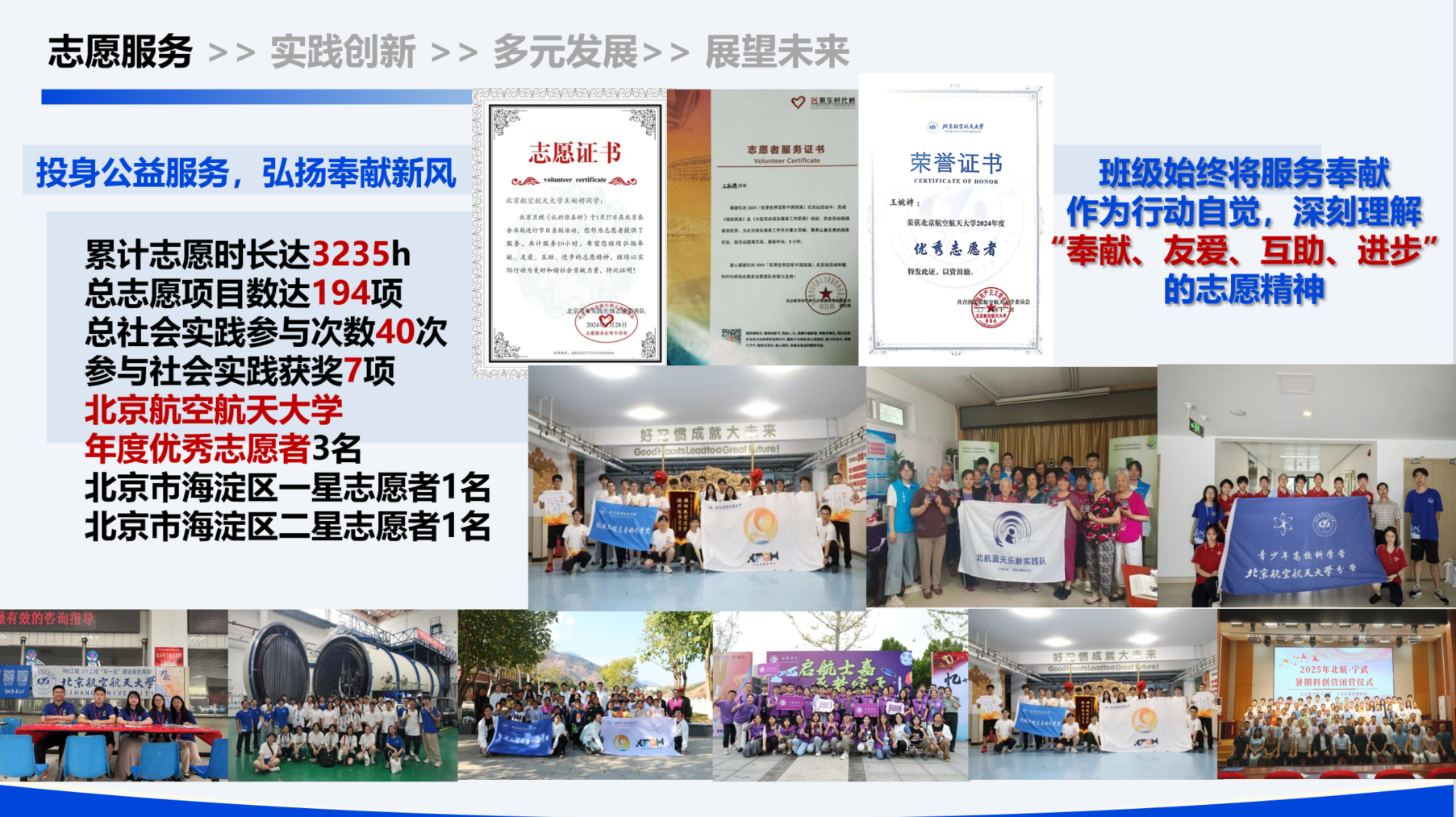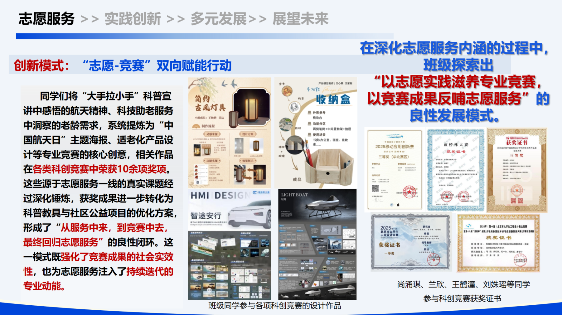 班级依托骨干组建的品牌志愿队伍——“大手拉小手”科普讲师团品牌,以“互动性、趣味性、前沿性”为特色,持续迭代课程内容,为88038威尼斯附小44个班级带去《飞行的奥秘》《认识太阳系和宇宙》《登上太空的旅程》《航空航天:从追赶到超越的征程》等精品课程,在青少年心中播下空天梦想的种子。服务网络广泛覆盖社区助老、赛会保障、爱国宣讲等多维度,并创新构建“志愿-竞赛”双向赋能模式,以志愿实践滋养专业竞赛,以竞赛成果反哺志愿服务,形成可持续的公益闭环,相关作品在各类科创竞赛中荣获10余项奖项。