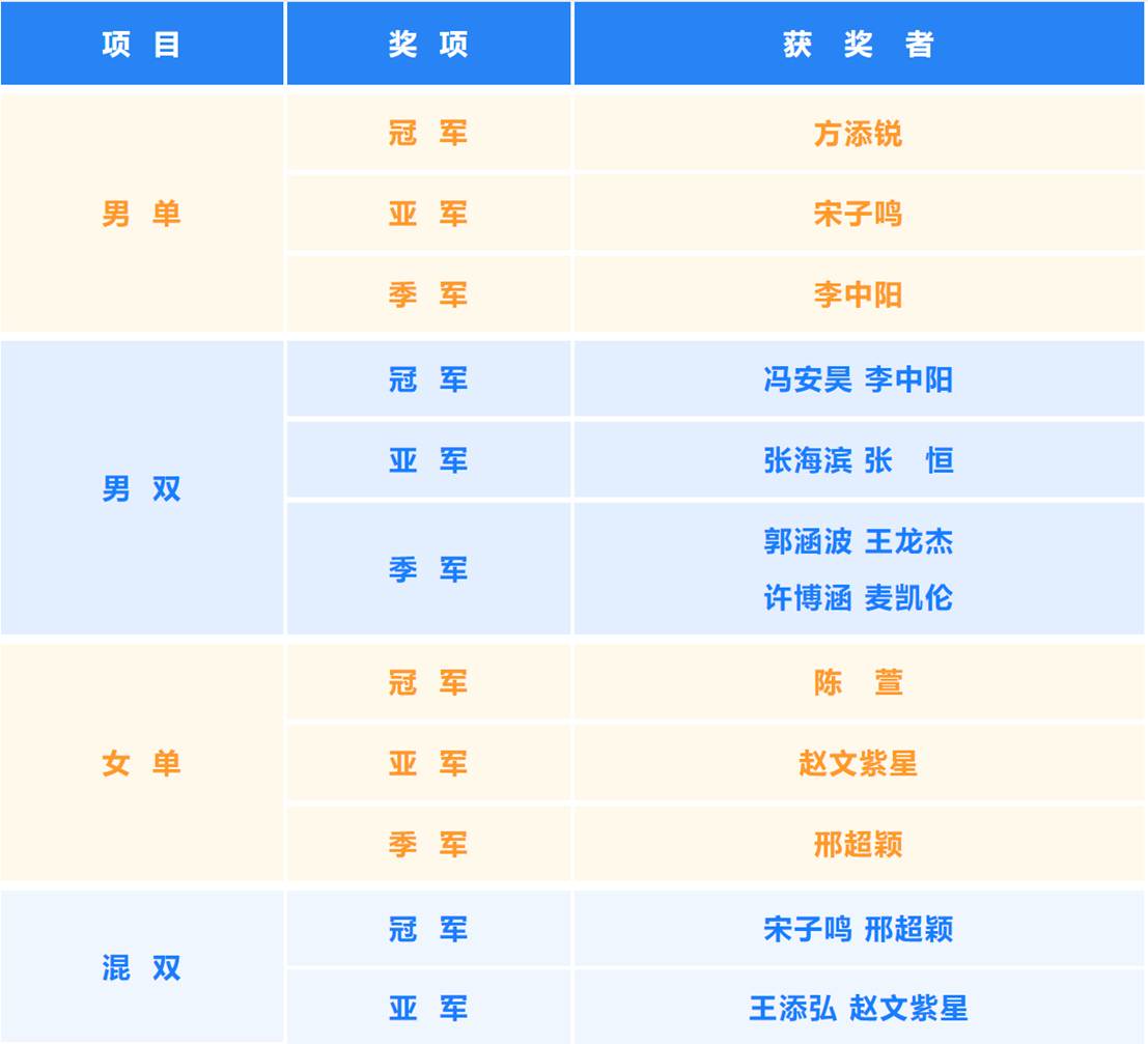 经过紧张刺激的激烈比拼,选手们以坚韧不拔的毅力、勇往直前的斗志,让这场乒乓球赛事成为了激情与梦想交织的舞台。最终比赛的获奖名单也新鲜出炉,他们分别是: