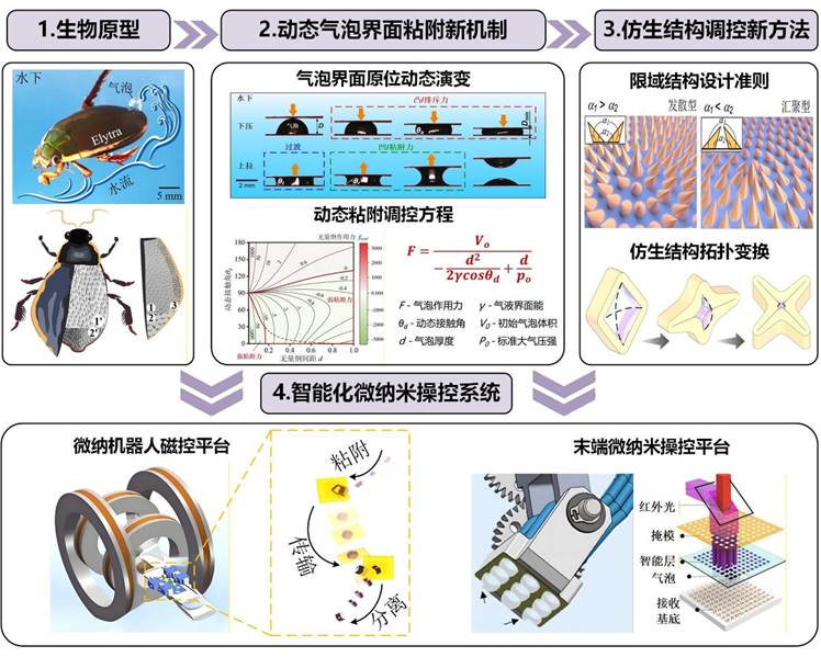 获奖博士论文面向新一代全柔性、微型化机械系统重大需求,针对超薄柔性电子基质和软质生物微粒在无损微纳操控和集成装配技术挑战,创造性地将气泡界面粘附体系引入到微纳操控技术领域,以水生甲虫龙虱作为仿生原型,揭示了润湿性与微纳结构协同调控的气泡粘附力学机制,建立了精确的动态粘附调控力学方程,突破了传统固-固接触粘附的剥离力极限(<10×10-3 Jm-2低于传统三个量级),为医工交叉提供了兼具生物相容性与力学适应性的微纳操控新策略。