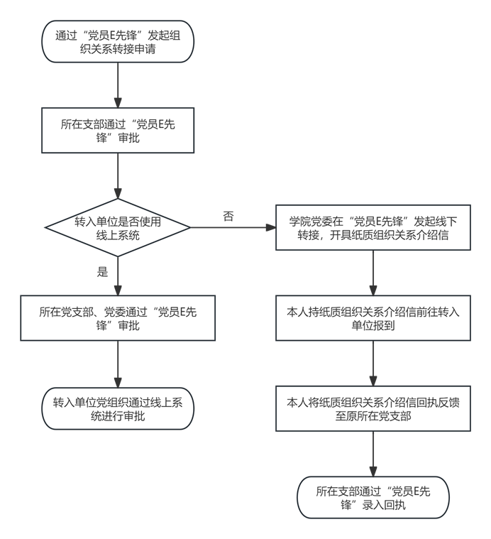 线上转接指组织关系转往已经使用“党员E先锋”、全国党员管理信息系统的学校或者单位。毕业生党员本人应及时与转入单位党组织联系,确定接收单位的支部全称和支部编码(省外的为具有转接权限的党委名称和编码),由个人或党支部在“党员E先锋”发起组织关系转接,学院党委审批通过,不需开具纸质介绍信。线上转接不产生纸质回执,毕业生党员到转入单位报到时应及时联系转入单位进行接收。