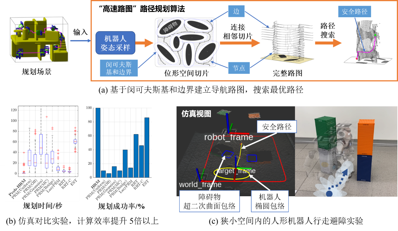 该项目提出了“高速路图(Highway Roadmap,HRM)”的路径规划算法,运用几何方法解决了机器人路径规划中关键的“狭窄空间”和“高自由度”的问题。其核心基于无碰撞位形空间边界的解析解。将机器人包络成椭球的集合,环境中的障碍物表示为具有光滑表面的严格凸体(例如超二次曲面)。通过计算位形空间障碍物边界,为机器人了提供无碰撞环境的先验经验,从而避免生成对于机器人无效的位形。进而,结合基于随机采样的路径规划算法,突破了高维问题中计算复杂度高的瓶颈,将所提的方法延伸到了多自由度的机器人上。相关成果发表在IEEE Transactions on Robotics (T-RO)期刊上。