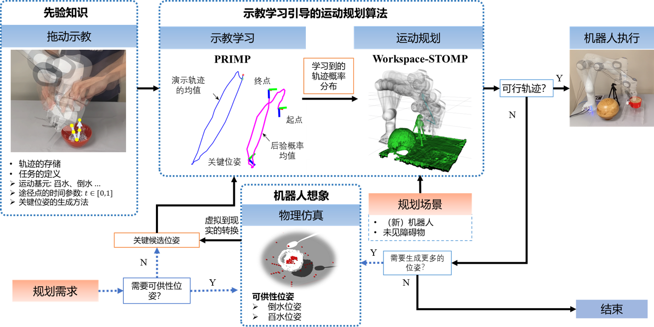 面向机器人在未知居家场景中执行复杂操作任务的需求,本研究提出了一种基于概率模型的模仿学习方法PRIMP(PRobabilistically-Informed Motion Primitives)与基于工作空间密度的机械臂轨迹规划算法Workspace-STOMP。通过学习物品可供性,在虚拟环境中模拟倒水、舀水等动作,得到机器人完成特定任务所需的关键末端六维位姿,从而生成全新操作轨迹,引导机器人操纵物品。所提出的算法提升了类人操作轨迹生成效率、新环境中避障成功率及任务完成度。相关成果发表于IEEE Transactions on Robotics (T-RO)期刊上。