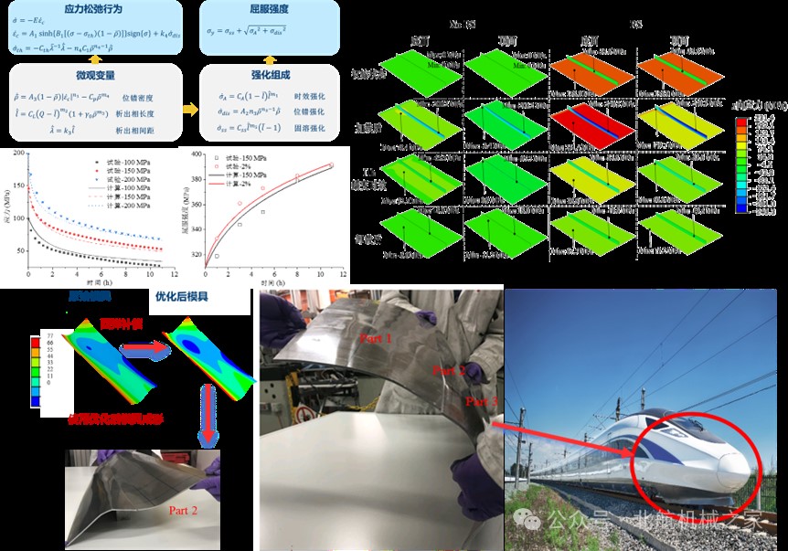 整体壁板是飞行器等运输装备的主承重结构。针对整体壁板成形过程中材料微观组织和材料变形及强度调控难的问题。建立了微宏观跨尺度统一本构模型,揭示了铝合金在塑性区域应力松弛机理,提出了回弹补偿算法指导了成形模具补偿性设计,实现了整体壁板蠕变时效成形的精确成形。