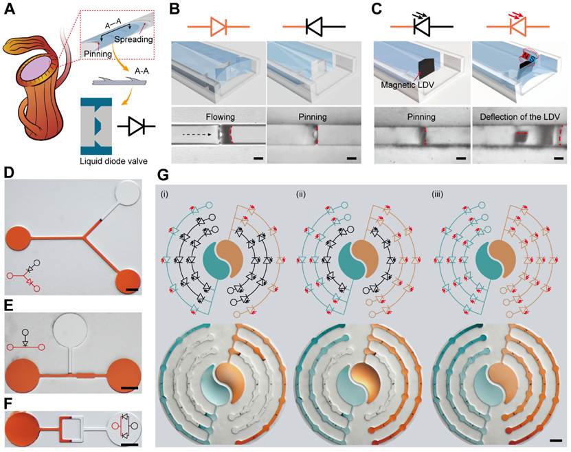 开放式微流控技术利用毛细力驱动液体实现自发流动,显著降低了微流控系统的复杂度。通常在开放式微流控设备中,需要微流控阀来控制流体。然而现有的毛细阀难以实现对液体流动的编程控制,这限制了复杂开放式微流控系统的构建。近日,88038威尼斯88038威尼斯仿生与微纳系统团队张鹏飞教授课题组受生物启发,提出了液体二极管阀(LDV)概念,LDV利用非对称毛细效应实现单向流动及反向固定,若采用磁性材料制成,可进一步在开放式系统中对多种液体的流动进行主动控制(图1),相关成果“Bioinspired Liquid Diode Valve Enables Programable Control of Liquid Flow in Open-channel Microfluidics”发表于权威期刊《Advanced Functional Materials》上。