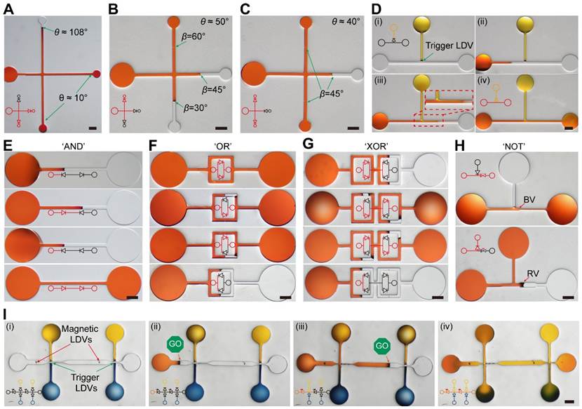 作者借鉴猪笼草口缘各向异性微腔结构,并将其简化为“门型”不对称立柱。研究首先表征并分析了微阀控制流体正向流动、反向自动钉扎,以及由阀芯偏转驱动的反向流动的机理。实验分析了阀门的静态调控规律与阀门结构特征参数的关联:正向流动时,随着流道表面本征接触角q0增大,液体浸润阀门的时间延长,边缘角b越大,正向流动的临界接触角qfc越高,实验所得到的临界接触角qfc与自由能模型高度吻合。通过实验确定反向钉扎的临界接触角qbc»30°,且对边缘角b与阀门缝宽度wg不敏感。通过磁偏转,反向钉扎的液体可在0.5 s内突破阀门,实现再次流动。研究表明,通过调节LDV的润湿性、边缘角、取向和主动偏转,可精确的控制液体的流动与钉扎。作者构建AND、OR、XOR、NOT等液体逻辑门,并演示触发阀、延时阀、选择阀等功能(图2)。通过磁场阵列顺序开阀,实现液体的有序混合等功能。